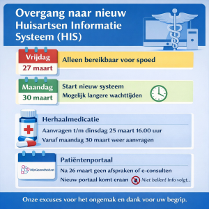 Op vrijdag 27 maart worden alle patiëntengegevens overgezet naar dit nieuwe systeem. Daarom is de praktijk die dag alleen open voor spoedgevallen.